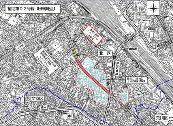 補助第92号線(田端北地区)は、本地区をほぼ南北に横断する路線であり、北側の田端四丁目付近土地区画整理事業、南側の田端二丁目付近土地区画整理事業の区間については、土地区画整理事業により整備しています。