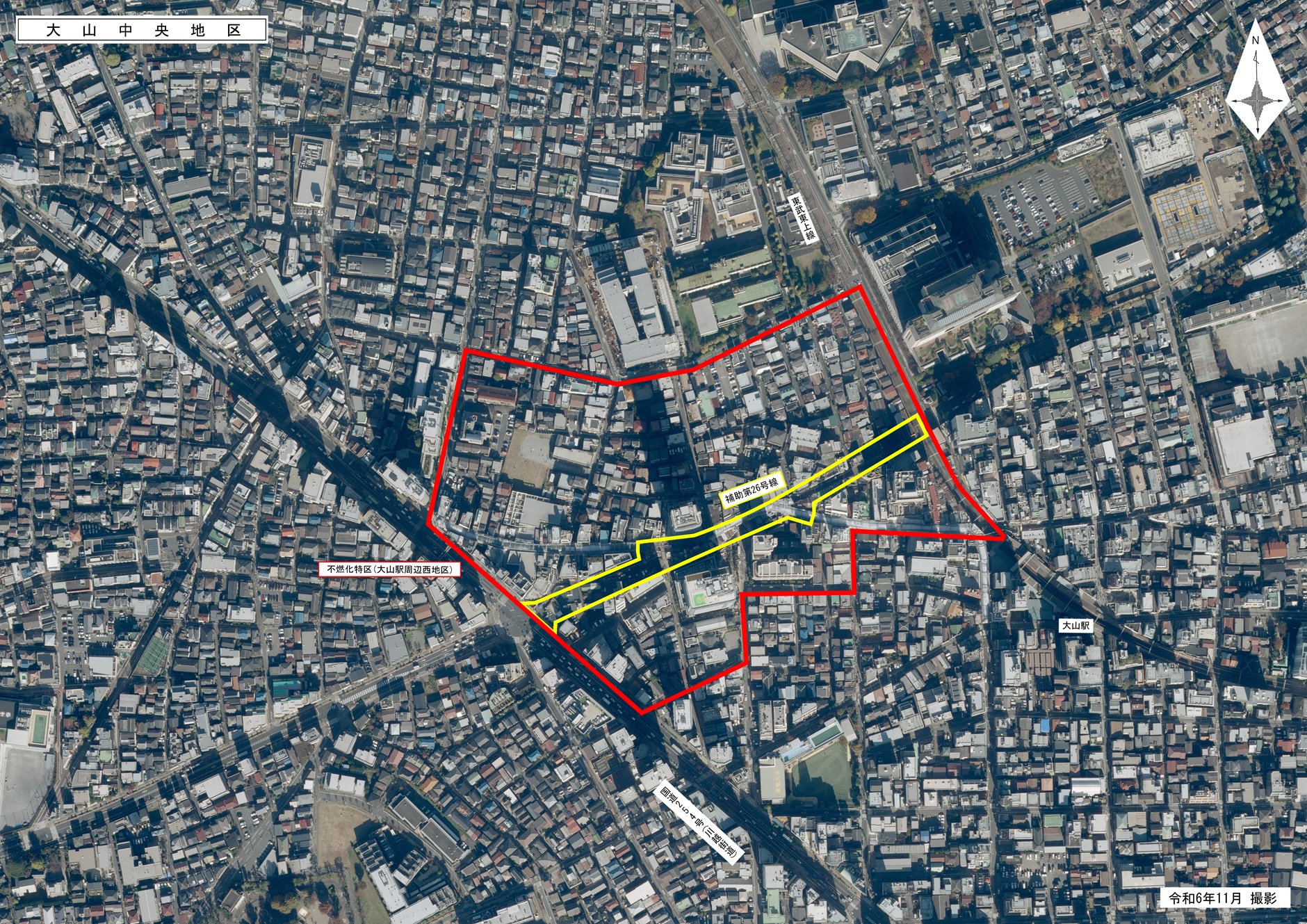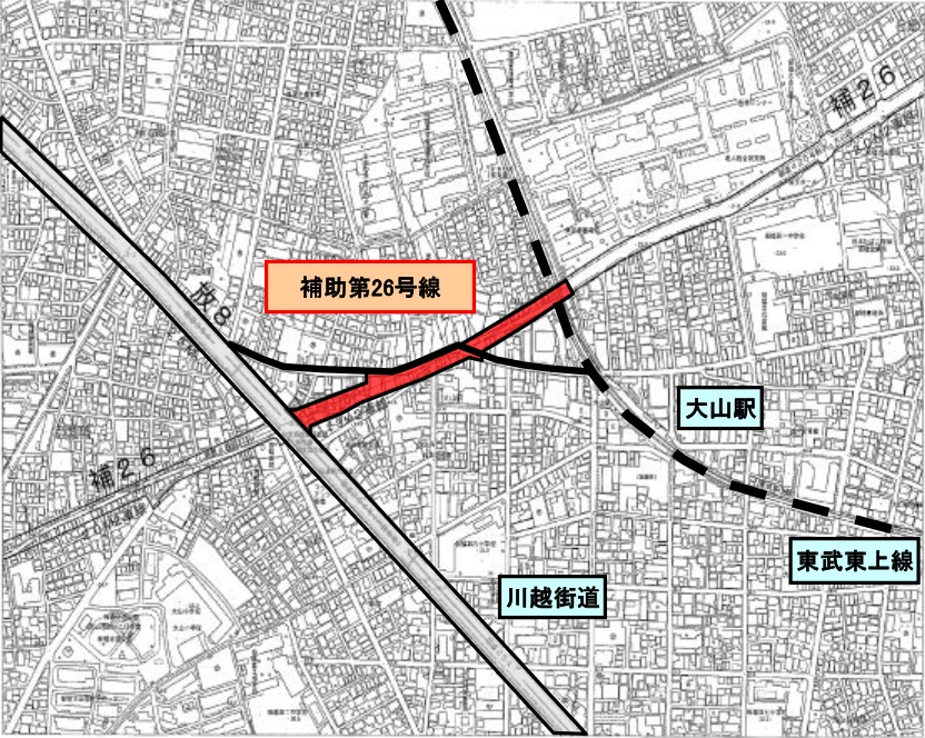 板橋区大山町付近の都市計画道路補助第26号線は、放射8号線(川越街道)と東武東上線までの区間で、防災都市づくり推進計画の整備地域(大谷口周辺地域)内に位置しています。