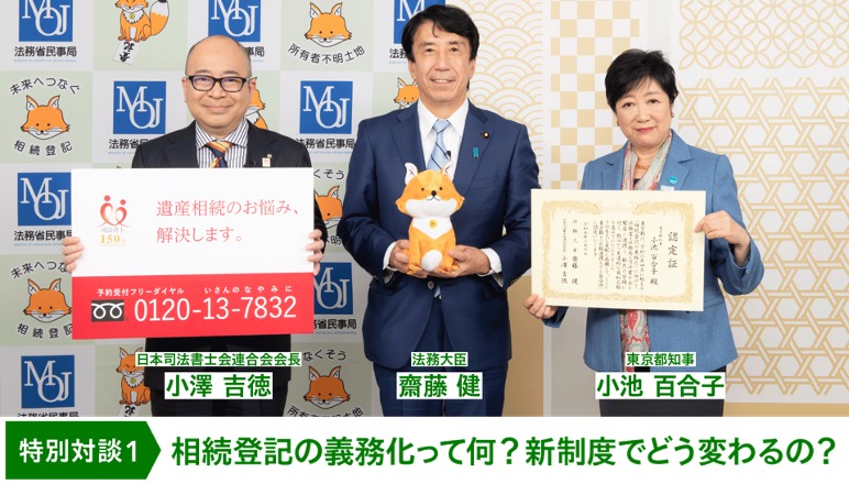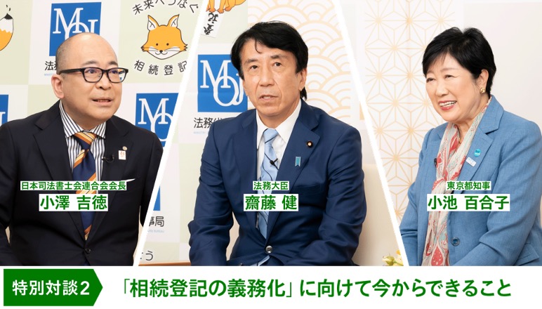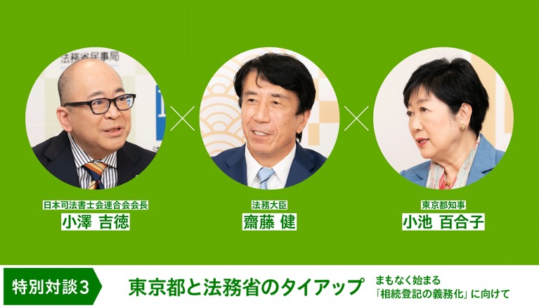 小池東京都知事が、斎藤健法務大臣と日本司法書士会連合会会長の小澤吉徳氏と「相続登記の義務化」をテーマに対談を行いました。