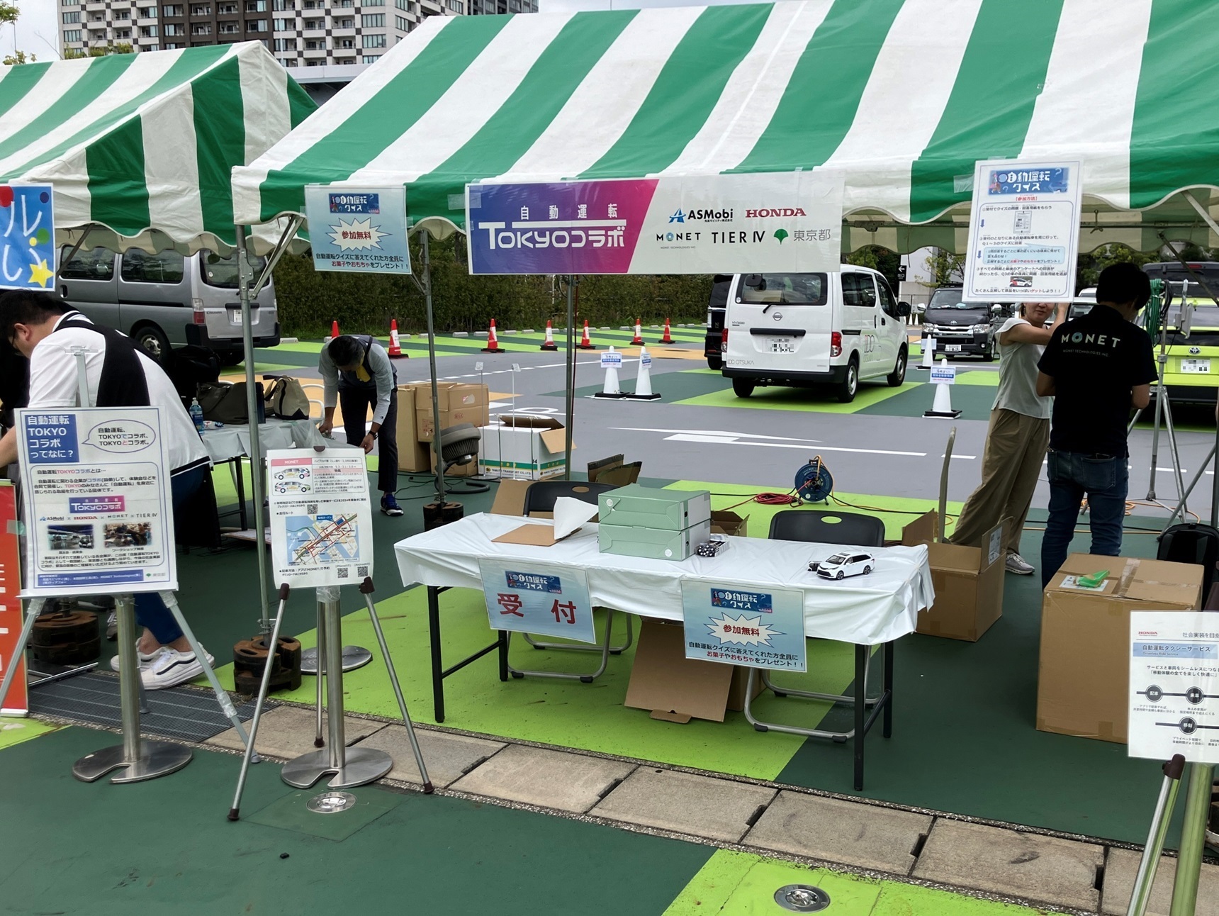 有明ガーデン スポーツエンターテイメント広場にて実施した有明まつり2024において、自動走行車の展示を行うとともに、自動運転の仕組みをわかりやすく説明したパネルの展示や子供向けの自動運転車両にまつわるクイズを実施