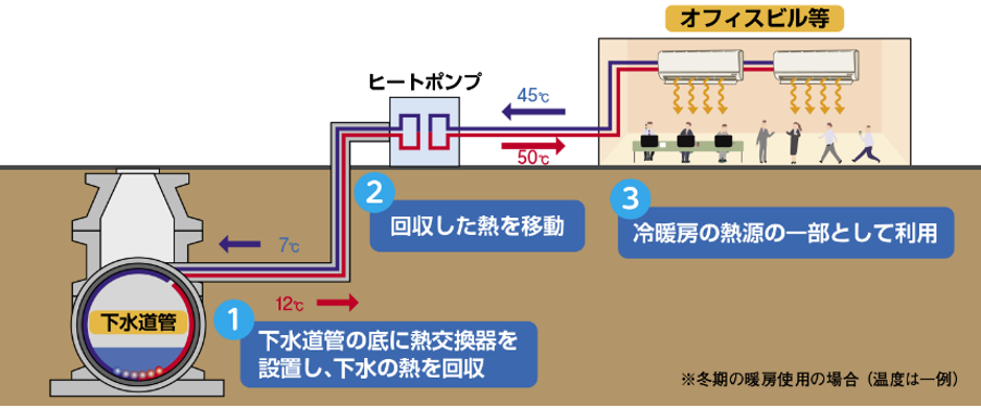 - 気温に比べ「夏は冷たく、冬は暖かい」という下水の温度特性をいかし、下水道管から回収した下水熱を地域冷暖房システムの熱源の一部に利用する国内初の事例