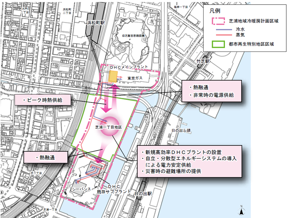 - また、新設する地域冷暖房プラントと既存の地域冷暖房プラントを熱導管により接続し、熱融通を行うことにより、地域全体のエネルギー供給効率向上や非常時のBCP強化に寄与する。