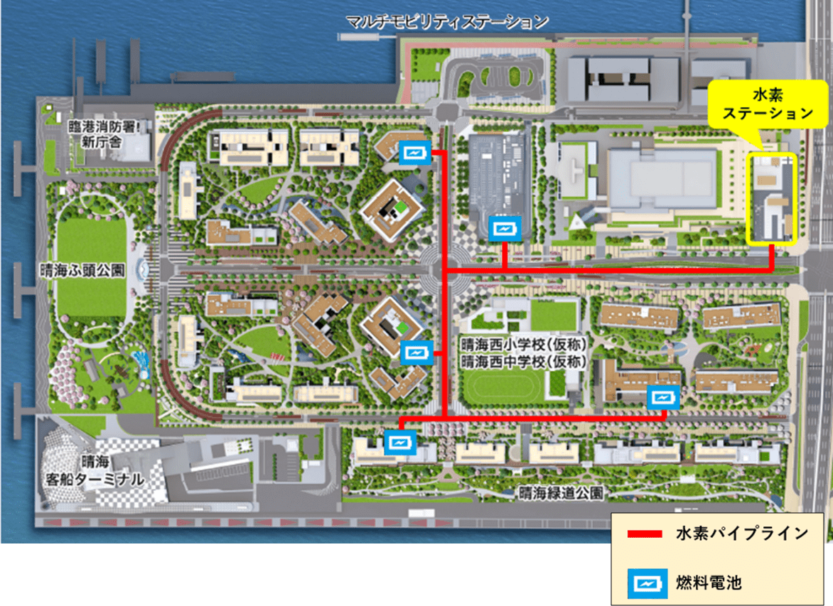 - 製造した水素をパイプラインで各街区へ供給し、純水素型燃料電池で発電した電力を住宅棟共用部等で活用
