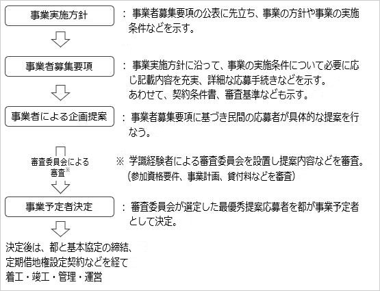 その際、事業実施方針、事業者募集要項を公表し、民間からの企画提案を募り事業予定者を選定している。