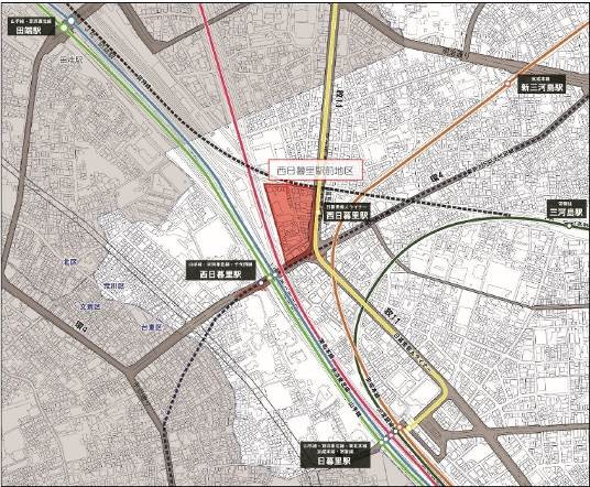 当地区は、JR・東京メトロ・日暮里舎人ライナーの三路線が結節する西日暮里駅前に位置し、また幹線道路に囲まれた交通利便性の高い地域である。しかしながら、敷地の細分化や建物の老朽化、交通結節機能の不足等により駅前らしい土地の有効利用がなされていない。