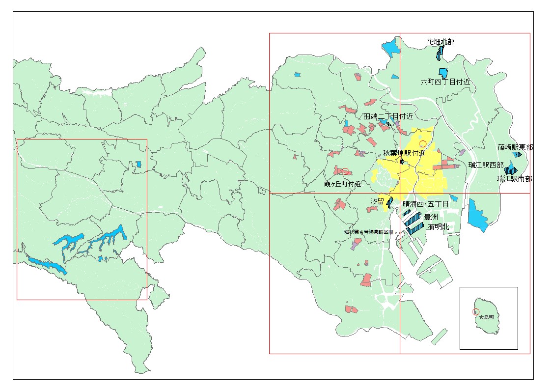 赤丸:火災復興区画整理、黄色:震災復興区画整理、赤色:都知事施行戦災復興区画整理、紫色:都知事施行都市改造事業、青色:その他の都施行区画整理(黒の縁取りは現在事業中の地区で、縦線の入っているものは換地処分済みの地区です。)