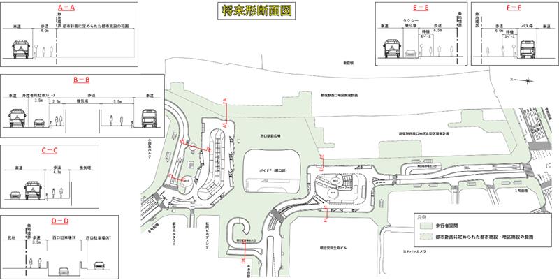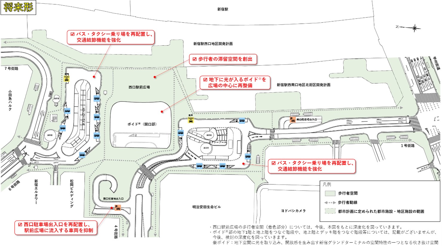 ※ボイド:地下空間に光を取り込み、開放感を生み出す新宿グランドターミナルの空間特性の一つとなる吹き抜け空間2.西口駅前広場(地下部)の道路と歩行者空間の平面配置